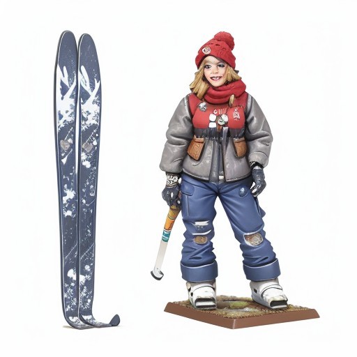 A hand painted miniature of a beautiful girl with casual skate clothes and a winter cap, waiting to ski while holding her skis. She stands in a relaxed yet eager pose, dressed in a loose jacket, baggy pants, and a cozy knit cap, all rendered in a vibrant, clear pixel style with big, well-aligned pixels. Her skis are tucked under her arm, detailed with sharp edges and bold colors. The background features a snowy slope dotted with pine trees under a crisp, pale blue sky, adding a chilly, adventurous vibe. Rich, award-winning craftsmanship shines through in the intricate hand painted textures of her outfit and the dynamic shading of the winter scene. UHD resolution enhances the striking, lifelike result, balancing her poised figure with the vivid, icy environment.