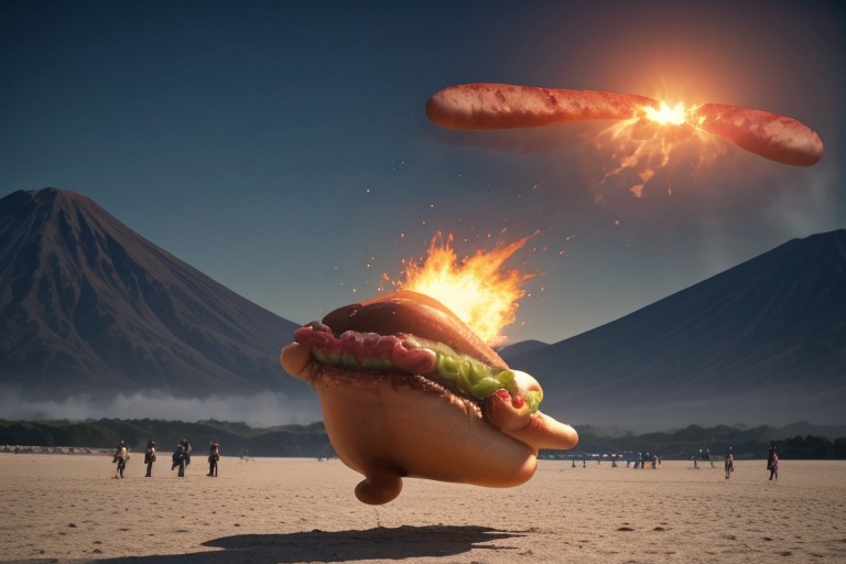(((hotdog))), flying hamburger, fire, (big text))), (((area 51))), ufo, volcano, apocalypse, fire, (beach background), s5e4b65r46r7vdr76rd657bdr46dsrr
