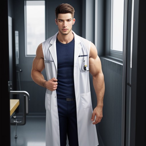 a beautiful 18yo male lean doctor is wearing a white sleeveless unbuttoned lab coat and is shirtless, showing his huge pecs and rippling abs, and he has short brown hair, full body shot, cover model, and he is inside a hospital, he is beardless and clean shaven and has a huge bulge in his crotch, cover model, dark tan and glossy sweaty skin, skin details, earrings and bright blue eyes, ultrarealistic, hyperdetailed photography, soft light, model look, shirtless, sleeveless