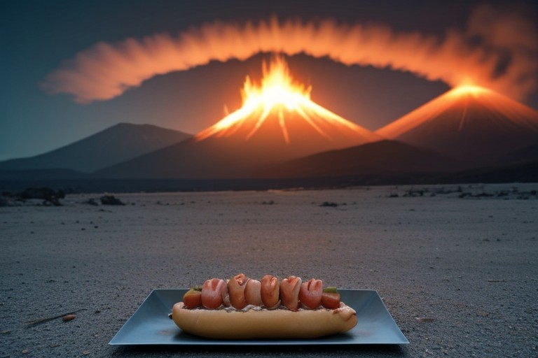 (((hotdog))), hotdogs, fire, (big text))), (((area 51))), ufo, mountain, volcano, apocalypse, fire, (beach background), tny7t67nt6