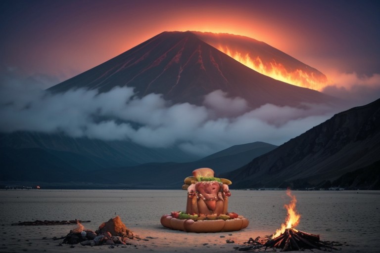 (((hotdog))), hotdogs, fire, (big text))), (((area 51))), ufo, mountain, volcano, apocalypse, fire, (beach background), ssyrybrdntr6untnu6t6t 6b