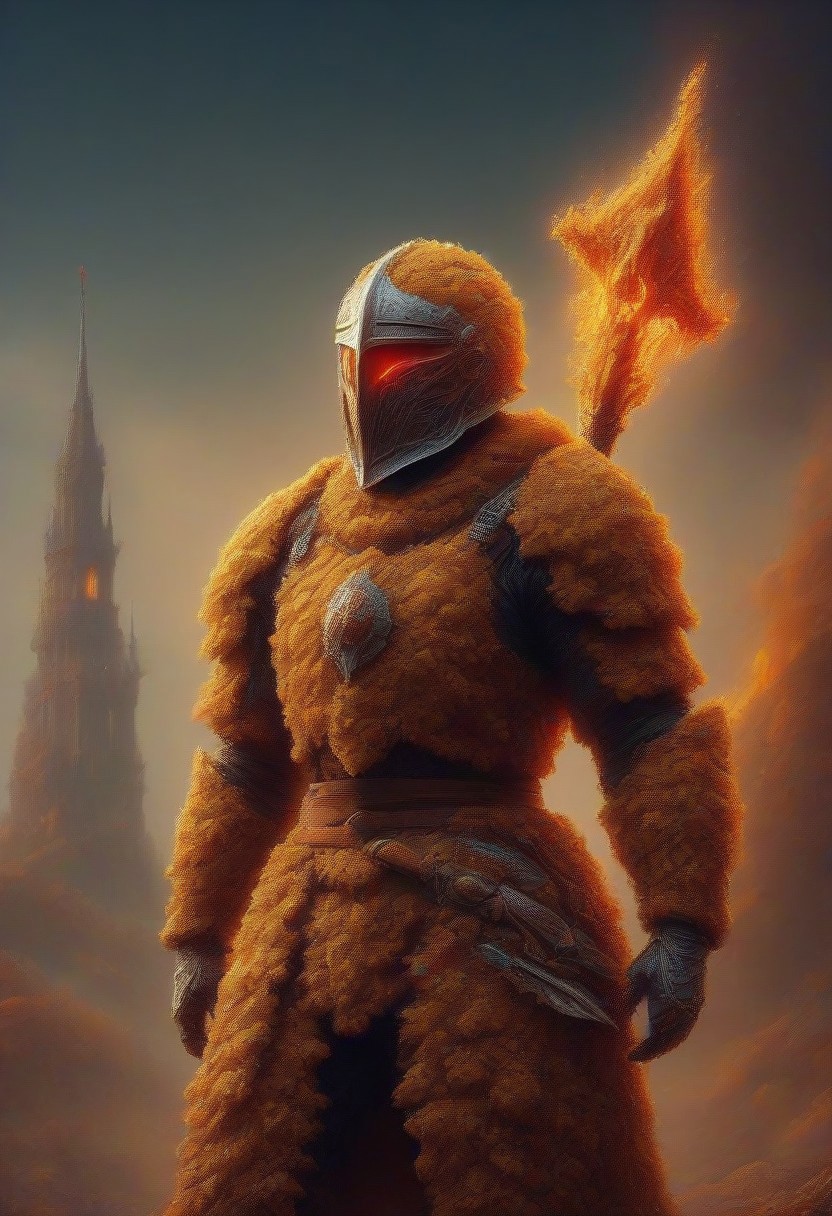score_9, score_8_up, score_8, score_7_up , DFC, Fullbody frontal shot, cinematic, (masterpiece), (best quality), (ultra-detailed), intricate details, absurdres, knight in plate armor made from fried meat, holding twohand battleaxe,