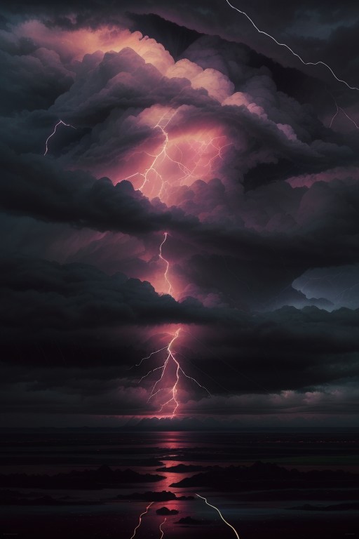 sky, thick_clouds, thunderstorm, white lightning bolts, raining,, open landscape