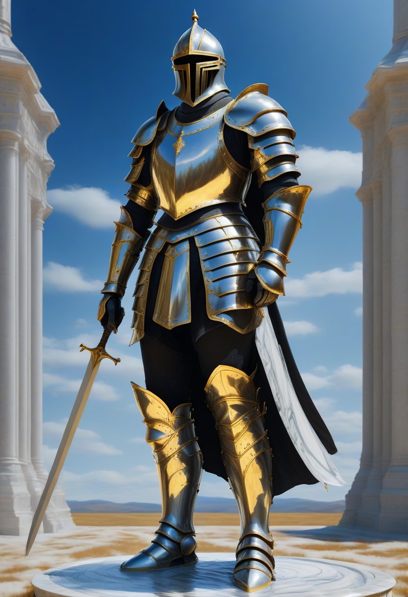 knight, armor made of Liquid Marble with golden details, midday, standing on the field, open sky, ultrarealistic