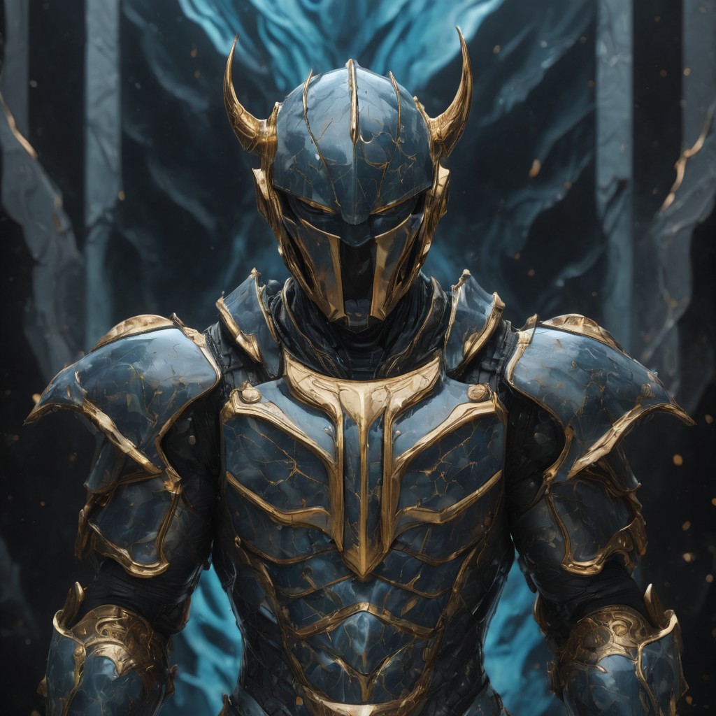 Liquid Marble, Golden Helm, Cyber-Knight Vibes, Metallic Sheen, Cinematic Detail