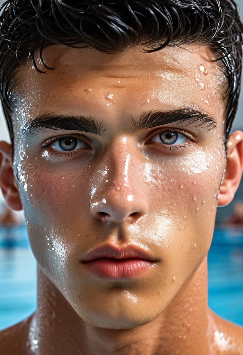 Male focus, close up, stunning masterpiece, ((best quality:1.2)), ((one stunningly handsome male swimmer)), shiny wet skin, athlete, handsome, black hair, 18yo, twink, perfectly detailed handsome face, detailed eyes, lithe, ultra-high-definition, sharp details, high quality, realistic, natural textured skin, 16k, intricate details, Expressiveh, thick muscular neck, sports, swimming hall, blushing, modern undercut hair, piercing eyes, pimples