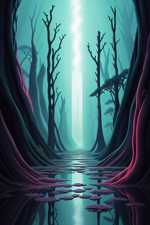 A fascinating and surreal display of color, reflections and refraction. A liminal space filled with floating panels shaped like jigsaw-puzzle pieces, each depicting a different scene, from mystical forests and barren deserts to pop art motifs and futuristic cityscapes. The refracted panels float inverted, creating a sense of depth and dimension. The overall ambiance is a blend of reality and fantasy, with a touch of otherworldly mystique, ultra-sharp, intricate details