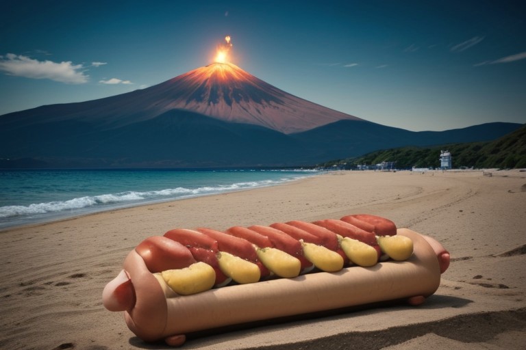 (((hotdog))), hotdogs, fire, (big text))), (((area 51))), ufo, mountain, volcano, apocalypse, fire, (beach background), a4wetvs5etvs