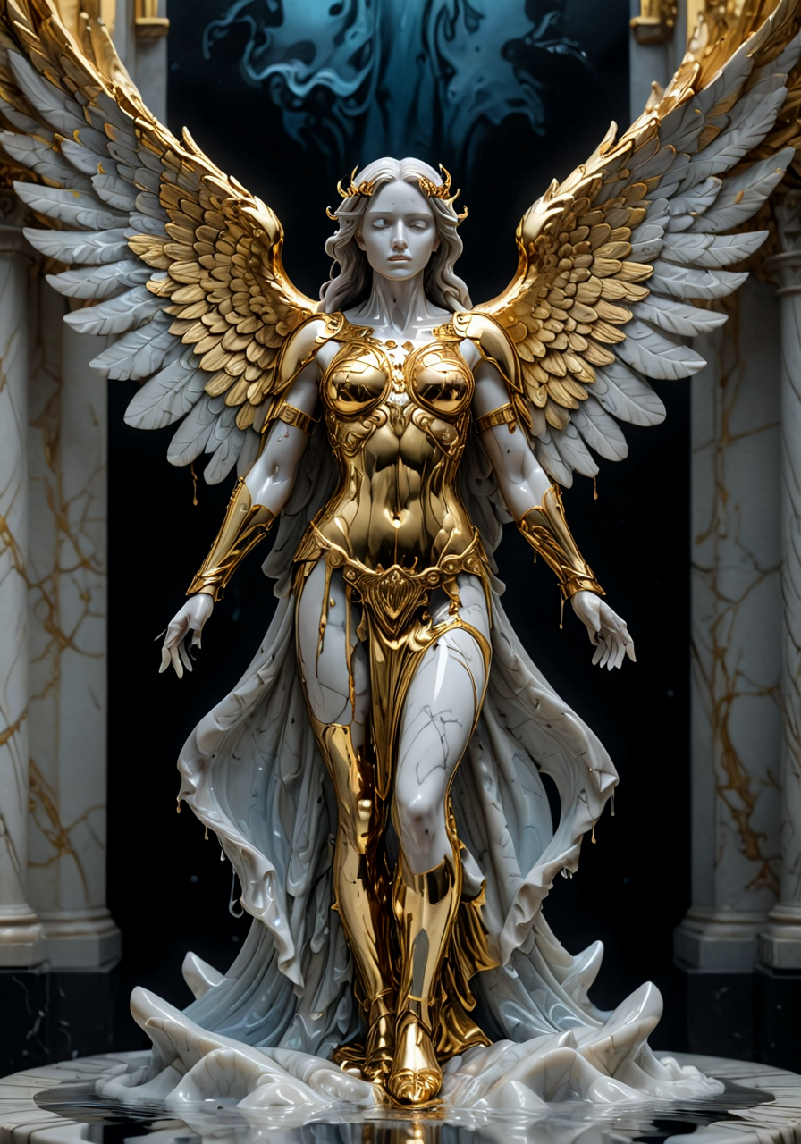 masterpiece, extremely detailed, sharp outlines, high contrast, fine details, intricate, (Liquid marble,dripping marble, flowing marble,:1.2) (liquid marble armored angel,) gold armor, gold breastplate, full armor, gothic cathedral background, intrincate background,, , GeekyXL_Liquid_Marble<lora:sdxl1.0\GeekyXL_Liquid_Marble.safetensors:1.0:1.0>