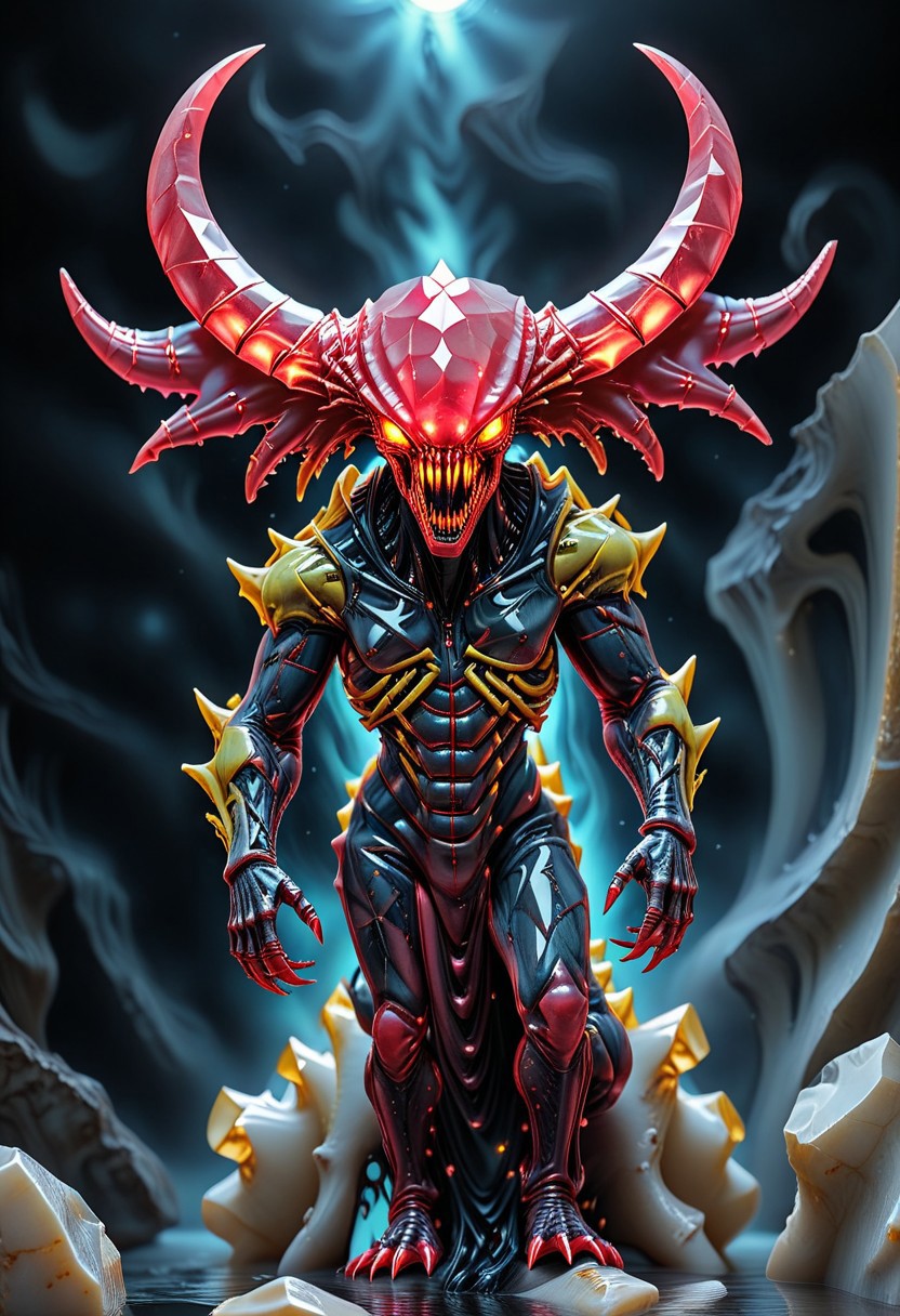 kftenhance, masterpiece, best quality, amazing quality, very aesthetic, high resolution, absurdres, newest, photorealistic, realistic, rp_slgd, xenif, crystal body, xenomorph, xenomorph made with golden liquid marble, xenomorph made with Soul-Gems, facing viewer, teeth, sharp teeth, tail, no humans, monster, colored skin, gold skin, claws, full body, stardust, stars, glowing, monster girl, Geeky SDXL Liquid Marble style