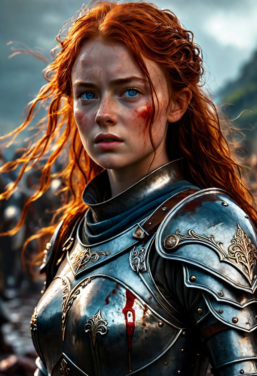 High resolution ultra-realistic of Beautiful burly Joan of Arc, 8k, capturing the intensity of the moment, cinematic lighting, standing on a bloody and stormy Battleground in a fighting pose, wavy red hair, realistic bloody dirty pale face, realistic blue eyes, fire, intricately designed iron and silver medieval armor, brown mini skirt, LOTR Aesthetic, perfect athletic figure, beautiful Sadie Sink as Joan of Arc, fire, ultra realistic, cinematic style, athletic figure, dark fantasy, dramatic lighting, wet and sweaty skin, dirty skin, athletic figure, dark medieval, dramatic lighting, Greg Rutkowski style,, Warrior girl on in iron armor, hyper-detailed, hyper-realistic, bright colours, Attractive 25 old years girl, Attractive, beautiful firm Breasts, sharp focus, digital painting, Photograph Taken on Nikon D750, Alphonse Mucha, 8K, athletic figure, Hyperdetailed, hyperrealism, Attractive, Attractive bust girl, asymmetric balance