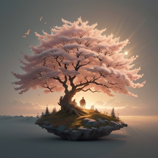 flat illustration of Japanese cherry tree, Masterpiece, High quality, RAW, detailed, volumetric light, dramatic lighting, backlight, plan background, tshirt design, simple background, flat background