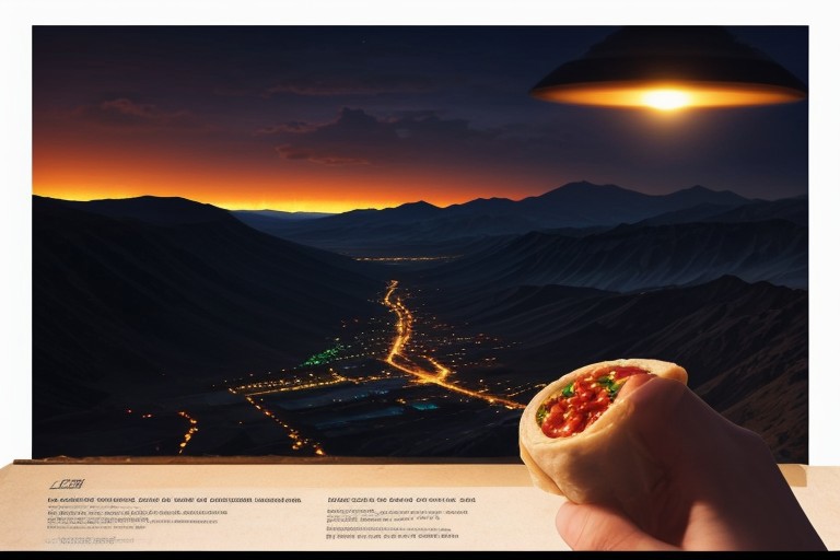 flying sandwich, burrito,,lettuce, pickles, ketchup. mustard, fire, big text, (((area 51))), ufo, mountain, volcano, apocalypse, fire, (city ruins background),
