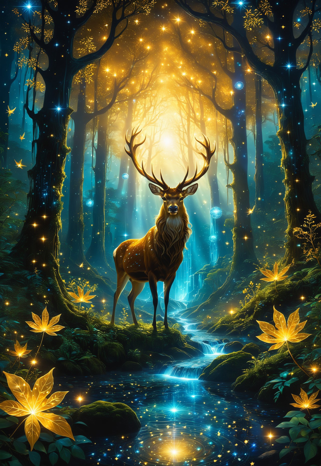 A glowing enchanted forest at night, filled with bioluminescent plants and softly shimmering fireflies. The trees are tall and ancient, their branches adorned with sparkling golden leaves that reflect the moonlight filtering through the canopy. A crystal-clear stream winds through the forest, its surface mirroring the starry sky above. In the distance, a majestic stag with glowing antlers stands peacefully, surrounded by an aura of mystery and magic. The scene radiates calmness, wonder, and timeless beauty <lora:add-detail-xl:1> <lora:Dynamic Poses:1>
