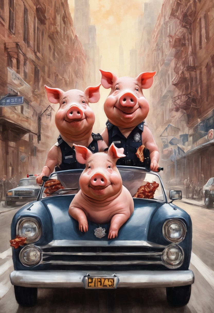 rating_safe, PsychadelicChaos, masterpiece, 2 (anthropomorphic pigs dressed as police) driving a (police car made of bacon), their heads hanging out the windows with goofy expressions