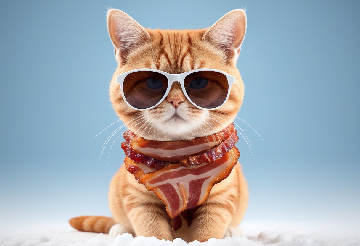 A Cute, (cat made out of MMM Bacon), (cat wearing sunglasses), solo, winter, 4k, high detail, high quality, realistic, full body,