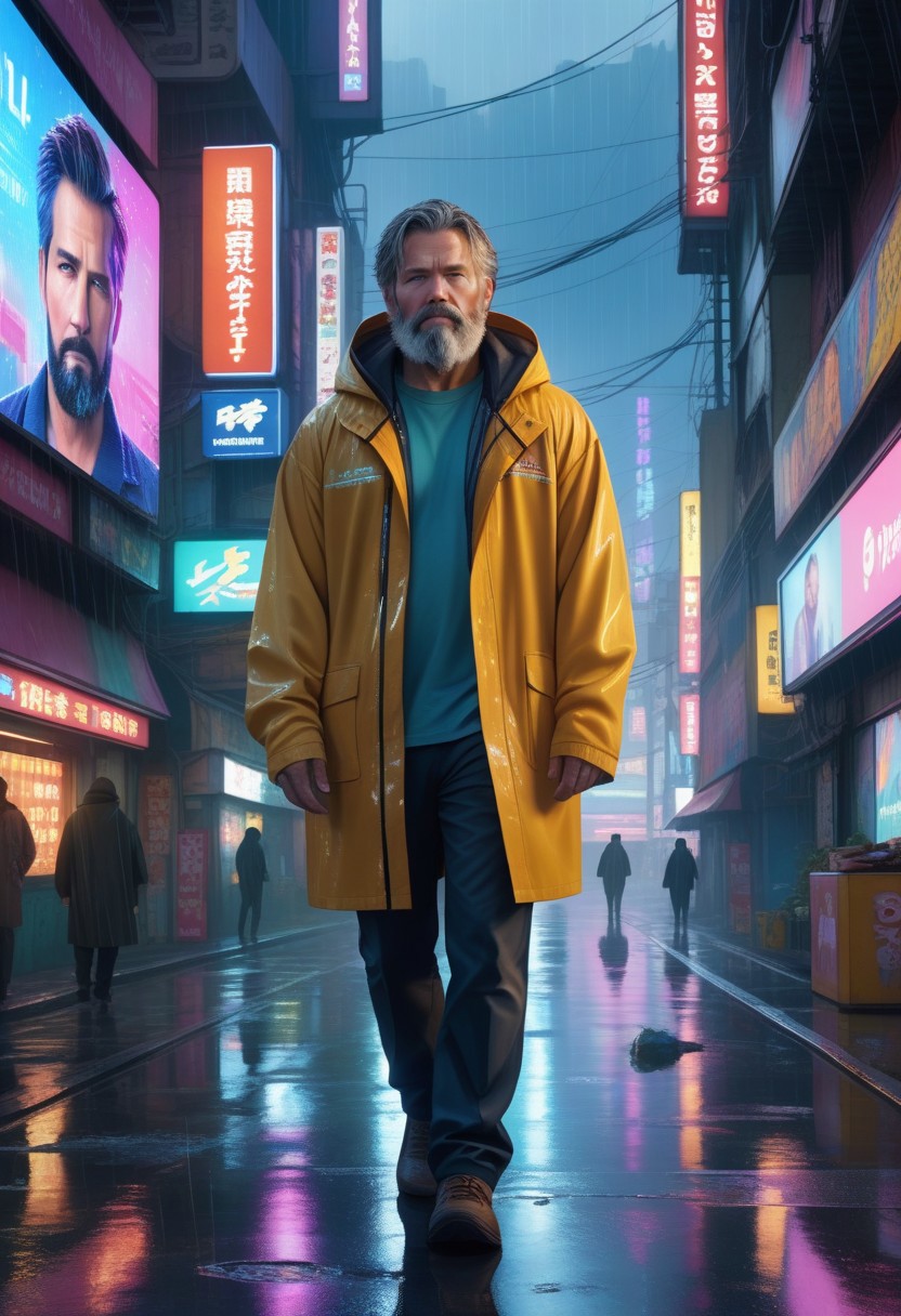 A hyper-realistic image of a weary, middle-aged man with a grizzled beard, shrouded in a tattered hoodie, wandering through a desolate cyberpunk street lined with flickering neon advertisements. His tired eyes catch the distorted reflections of digital ghosts in the rain-slick pavement, holographic projections of luxury and excess shimmering against his threadbare clothes. Above him, colossal billboards beam looping corporate slogans, promising a future he will never afford. The air is thick with the scent of ozone and damp concrete, the electric hum of distant drones blending with the rhythmic patter of rain. He walks onward, a forgotten soul in a world drowning in synthetic light.
