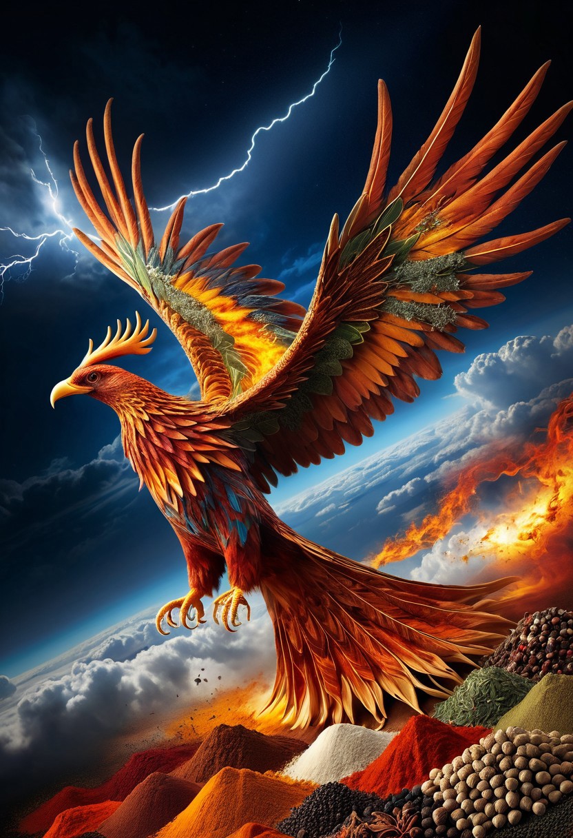 ((herbs_morf:1.5))made of variety of spices, digital art images, beautiful, fantasy, and complex, detailed portrait of a Phoenix. Flying in the sky, flying:1.4, wings spread wide, colorful, beautiful, closeup shot, flash, lightning, bolt sea, night time, cloudy, masterpiece, photorealistic, highly detailed,