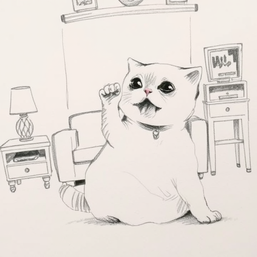 A pencil sketch with bold strokes. A fugglers cat playing in the living room, white background.
