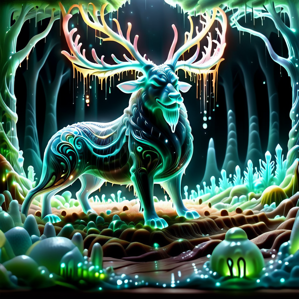 embedding:lazyup,sl1m3d,slime-morph, a crystalline stag with antlers of frozen light, standing in an enchanted forest of glowing slime mushrooms and liquid rainbows <lora:Slime_Morph_V4_(1):1.0000000000000002> <lora:add-detail-xl:0.9000000000000001>