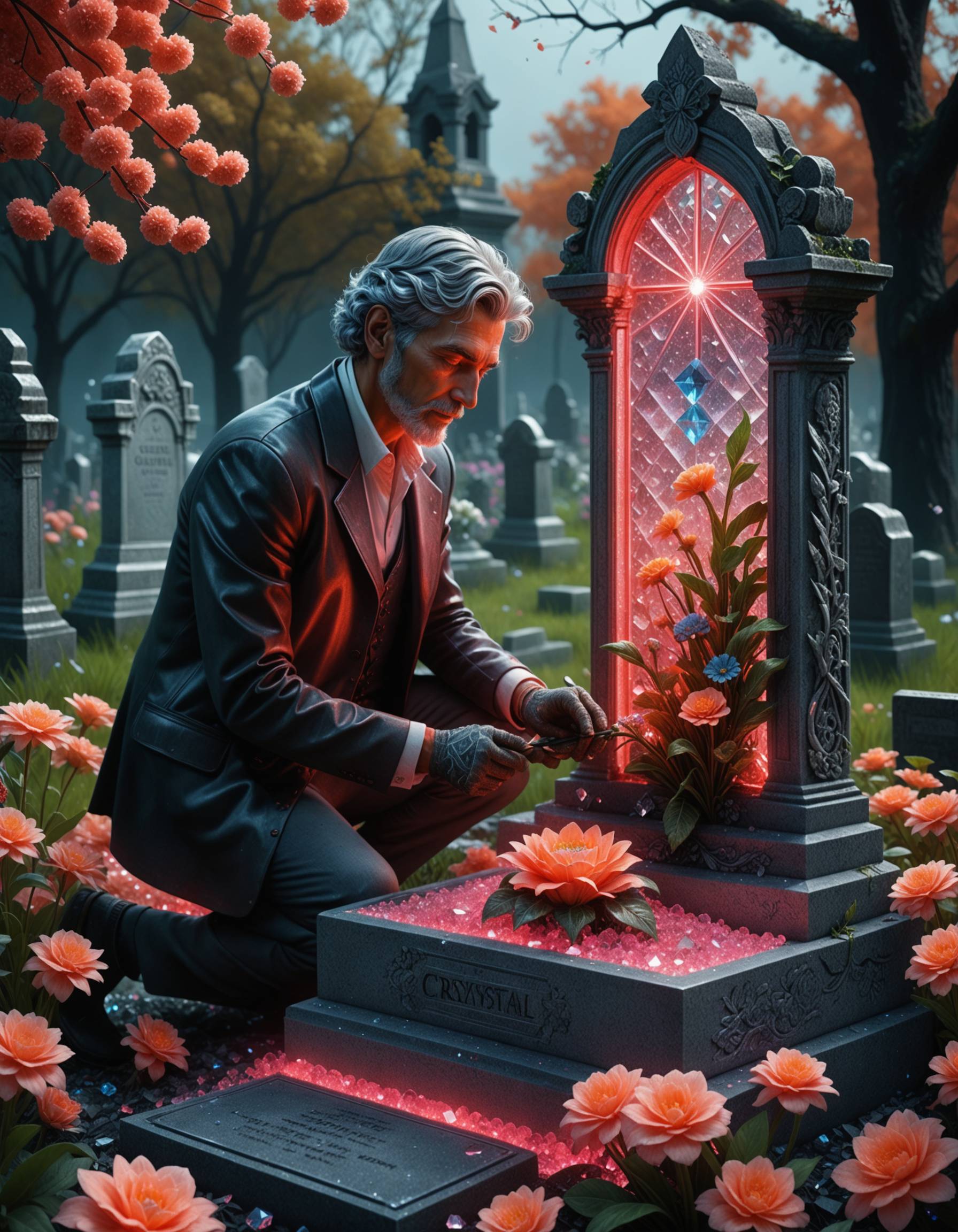 (masterpiece:1.2), (best quality:1.2), highly detailed, realistic texture, sharp details, extremely delicate and beautiful, realistic cg 8k wallpaper (Gentle gardener nurturing his flowers made of crystals:1.5), Abandoned cemetery, gravestones fallen and broken, nature reclaiming the final resting place., Neon red and neon peach <lora:mo:0.5>