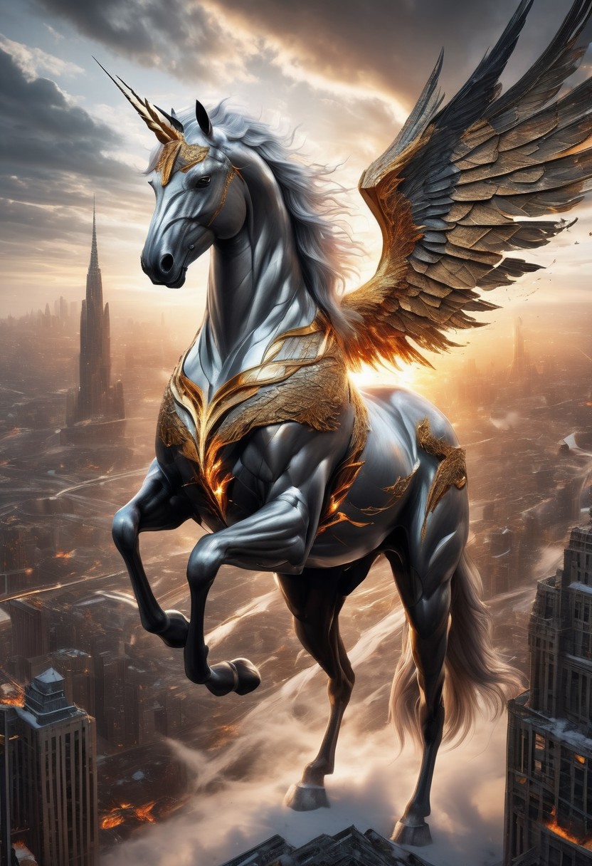 digital art images, beautiful, fantasy, and complex, detailed portrait , a unicorn made out of iron Flying in the sky, flying:1.4, wings spread wide, fiery colors, deep white, electric black, molten golden edges, beautiful, closeup shot, snow, city, day time, sun, masterpiece, photorealistic, highly detailed,