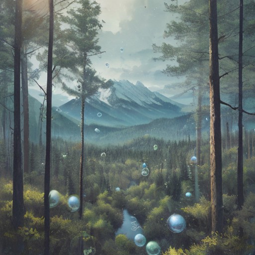 Masterpiece, high-resolution, tall mountains, pine forest, multicolor bubbles floating