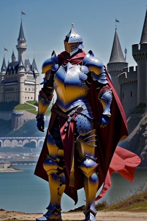 1boy, solo, solo focus, teenage, wear medium armor, black-red color armor theme, outdoor, cape, castle in the background, knight, armor, helmet, body straight to viewer, front body view, full body