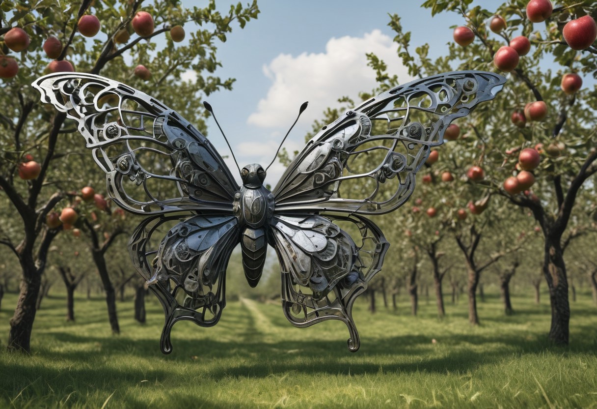 Masterpiece, detailed, 8k, intricate primate butterfly made of iron, flying, apple orchard background