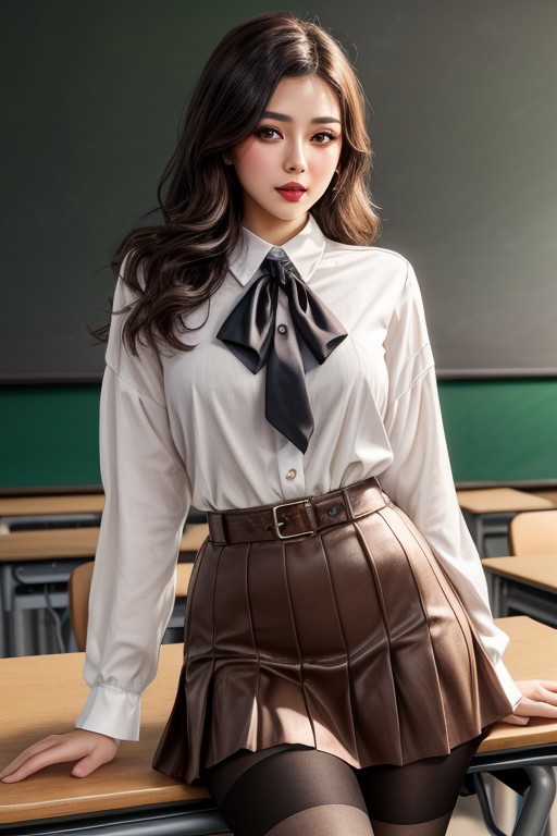 create a striking picture of a very busty 25 years old student from venezuela, standing infront of her desk in the classroom, huge tits, with straight thick dark brown wavy hair that frames her cute and beautiful face. she wants you, Her big captivating brown eyes hold a hint of mystery, and her lips are adorned with a bold shade of crimson, She wears a playful shirt and an expensive pleated skirt, she wears stockings and a tie, the colors contrasting elegantly against each other, her love gaze and poised demeanor take center stage, capturing the essence of her youthful charm and allure, well endowed, hair bow, extra large breast, very detailed and perfect face and half body, natural beauty, uhd, High quality, high definition, clear image, perfect face, perfect body, very big boobs, approaching perfection, slightly drooping eyes, glamor, bg_imgs, epiCPhoto