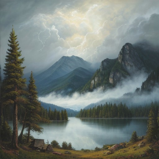 Masterpiece, high-resolution, oil painting, tall mountains, pine forest, log cabin, lake, large storm clouds in the distance