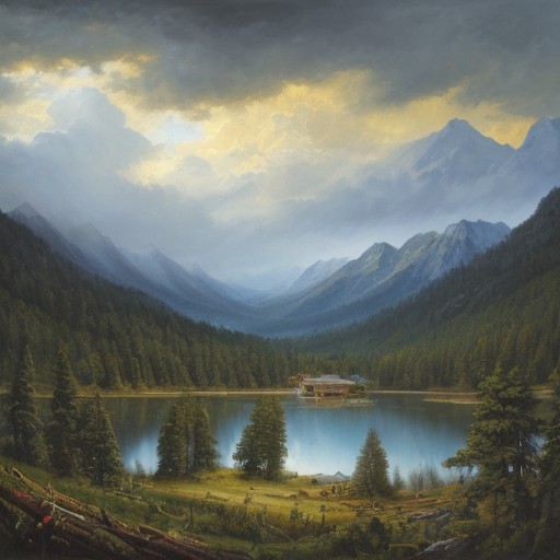 Masterpiece, high-resolution, oil painting, tall mountains, pine forest, log cabin, lake, large thunderstorm clouds in the distance