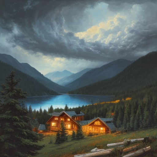 Masterpiece, high-resolution, oil painting, tall mountains, pine forest, log cabin, great lake, large storm clouds in the distance