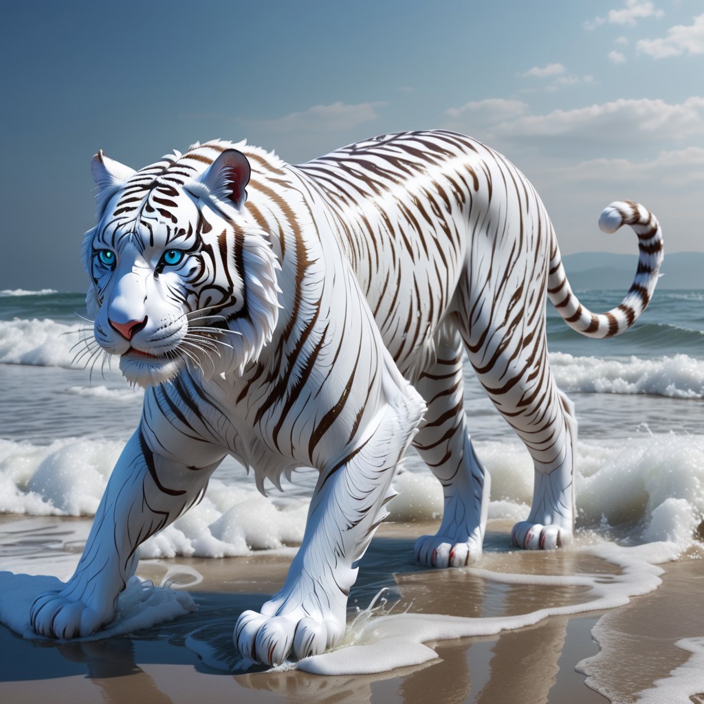white tiger, transparent wings made of water, horn unicorn, running on the sea, full size, best quality, masterpiece, shining details, lots of details, perfect detailed face, shnywrld