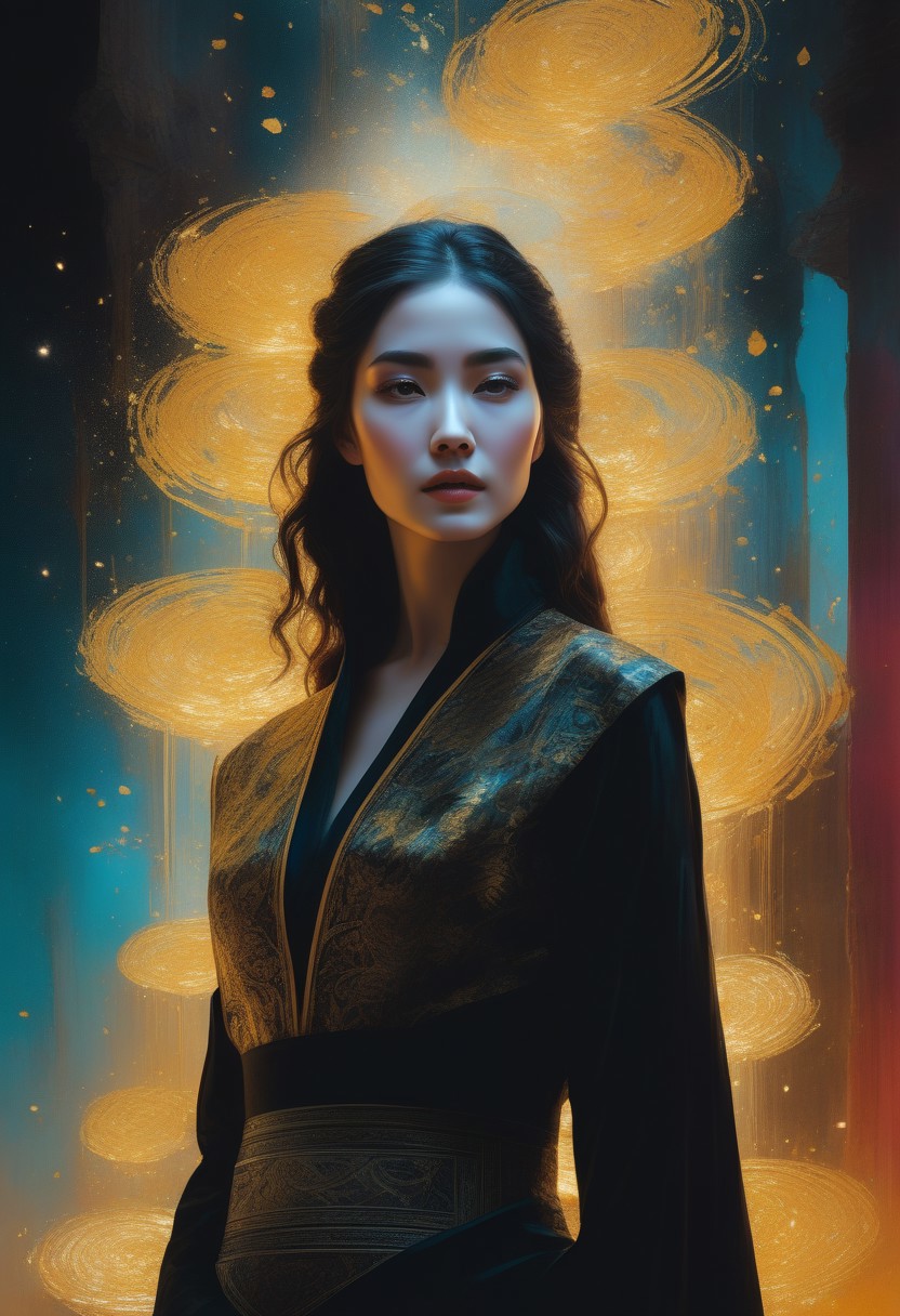 score_9, score_8_up, score_8_up, Cinematic composition,masterpiece, resplendent highlighting, 8k. 1girl, a beautiful oracle with an open glowing book, full body surreal, fragmented, intense colors, liquid, unreal parts, alluring, fluid, perfection, gothic. Face dynamically highlighted, Illustration, klimt Bill Sienkiewicz. maximum detail, Chinese watercolor and ink technique. Gold leaf highlights. <lora:xl_more_art-full_v1> <lora:epi_noiseoffset2>3