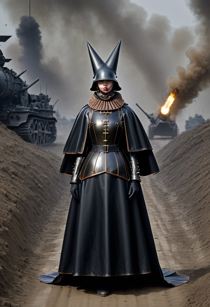 <lora:TC_ArtilleryWitch-PONY:0.8> artillerywitch, helmet, neck ruff, cape, armor, 1girl, solo, one arm up, bomb shell, latex bomb, full body, trench warfare, WW1 trench background, score_9, score_8_up, score_7_up, score_6_up, shnywrld