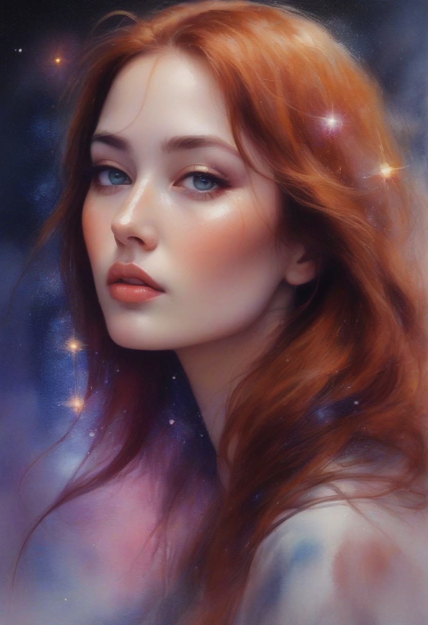 A beautiful lady with flowing red hair, cosmic stars and planets, soft focus, 8k resolution holographic astral cosmic illustration mixed media by Pablo Amaringo blending into a portrait of The Damsel of Sanct Grael by Dante Gabriel Rossetti, Happy splashy Watercolour by Tran Nguyen Jeremy Mann Frank Frazetta Carne Griffiths, WLOP, JB, Waterhouse, Josephine Wall, WLOP, chaotic cinematic pastel colours, perfect Wide long shot visual masterpiece