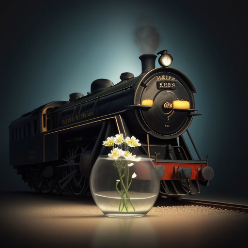 Extremely detailed, 8k sci fi wallpaper, a photo of the large Isometric_Dreams, Isometric view of a painting of a flower in a vase with a train on it's side and a building in the background, celtic elements, subsurface scattering, specular highlights, dark theme, art by artgerm, duskametric15