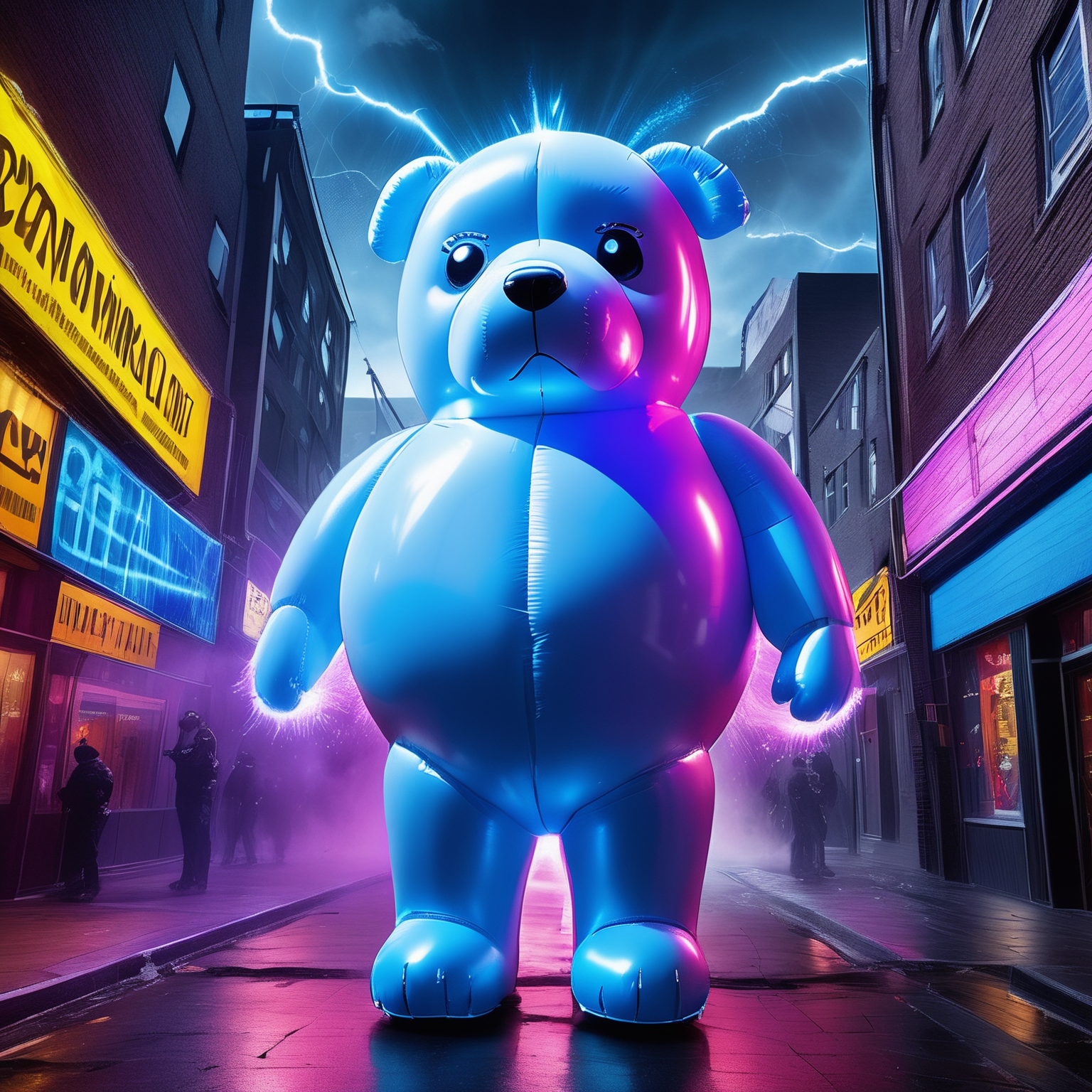 epic ultra-detailed photograph of shnywrld (inflatable:1.0) police officer, inflatable latex magnum gun, apocalyptic neon vapor cityscape ablaze, holographic badges erupting, cyber rain torrents cascading, lightning strikes illuminating reflective surfaces, extreme dutch tilt, massive lens flare, digital fracture distortion, explosive particle storm, volumetric god rays piercing darkness, motion blur action pose frozen in time, chromatic aberration, dystopian smoke plumes swirling, ultraviolet spotlights slicing through fog, cinematic dramatic shadows, extreme contrast, HDR hyper-reality, power surge effects, aggressive depth of field, shattered glass fragments suspended mid-air<lora:shinyworld_2dim:1>