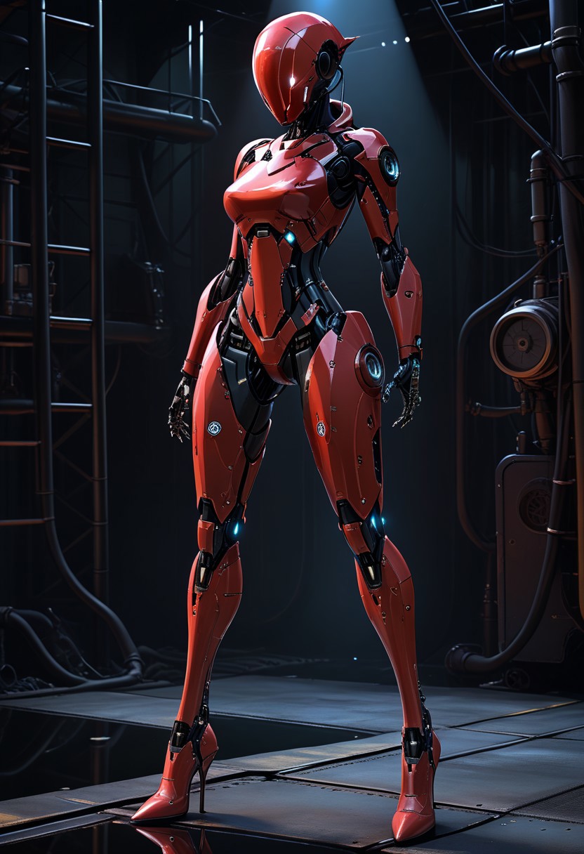 score_9, score_8_up, score_7_up, masterpiece, best quality, very aesthetic, absurdres, ultra-HD, cinematic lighting, vivid colors, beautiful robotic bodysuit, knee high stiletto boots, steampunk background, ultra-glossy reflection, soft glowing sheen