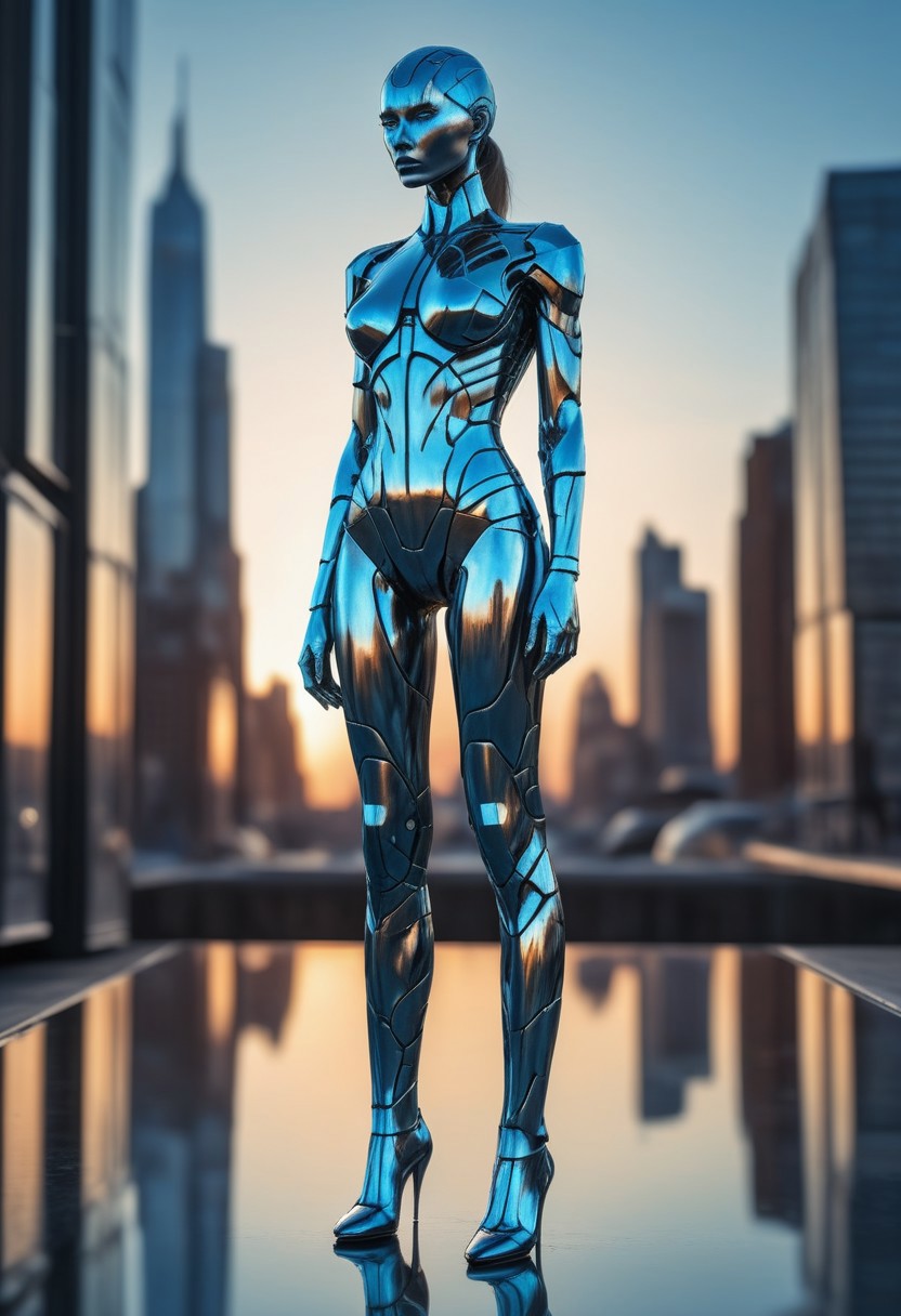 higly detailed, full length photo of a woman, skin made of iron, polished to a hig reflection, retrofuturistic style, blurry city made of polished iron in the background, blue glow eminates from within her body, sunset