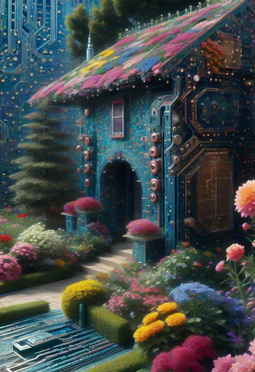 masterpiece, hyper detailed, (garden with flowers made of circuits:1.5), wm_cyber