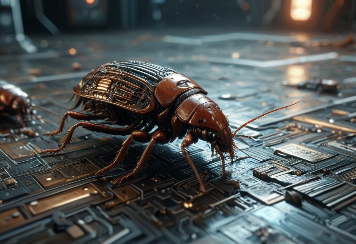 Masterpiece, detailed, 8k, close up shot,wm_cyber cockroach crawling across dirty science fiction floor, boken
