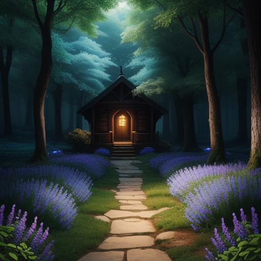 An echanted fantasy forest landscape. Masterpiece, a blue flowers, purple flowers, glowing lights in the air, stone pathway, wooden house, trees. Highres, detailed, cinematic, beautiful, magical, ethereal, fantastic, vibrant colours