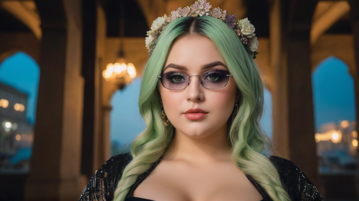(8k, RAW photo, highest quality) hyper-realistic, (Selfie view:1.5) of a beautiful ((Curvy-plus-size)) woman, big breasts, detailed Sage Green eyes, wearing a Visual Kei Cybergoth Queen with Neon Hair and Accessories look, Mint Blonde hair color, milkmaid braid, wearing a hair flower, lifted up, masterpiece, with a envious expression, A cityscape reflected in a pair of sunglasses., Candlelight in an ancient temple. lightning the scene, unity 8k wallpaper, ultra detailed, beautiful and aesthetic, best quality, intricate, saturated colors, sharp focus, 8k textures , intricate, highly detailed, sharp focus, insane details, intricate details, hyper detailed, exposure blending, hdr, hyper-realistic, (high detailed skin:1.2), uhd, dsir, soft lighting, high quality, film grain, shot with Nikon Z6 II, Leica APO-Summicron-SL 50mm f/2 ASPH. lens, f/32,, score_9, score_8_up, score_7_up