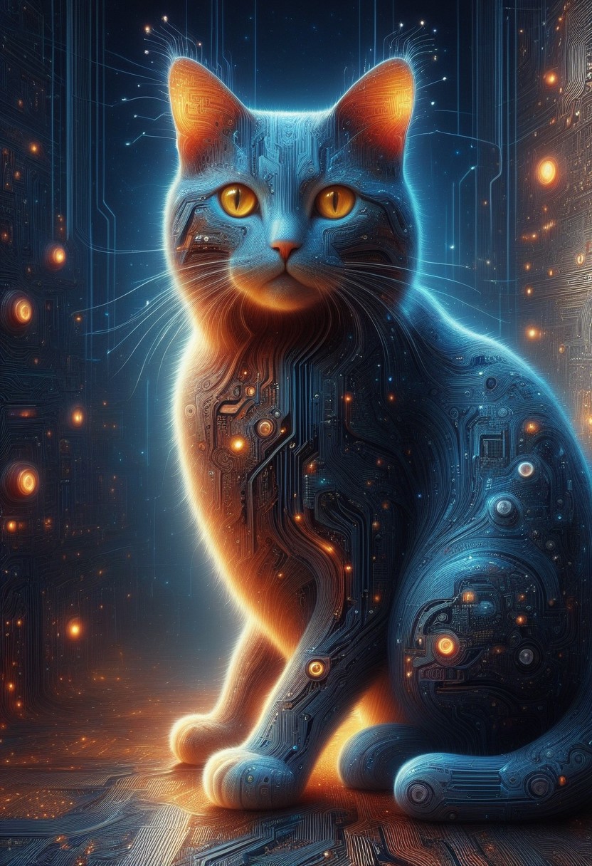 (rating :safe), (rating:pg),high quality,masterpiece,high quality,masterpiece,absurd resolution,amazing aesthetic ,cat,animal,made of circuits,wm_cyber,