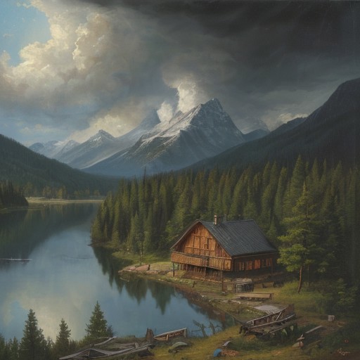 Masterpiece, high-resolution, oil painting, tall mountains, pine forest, log cabin, lake, large storm clouds in the distance