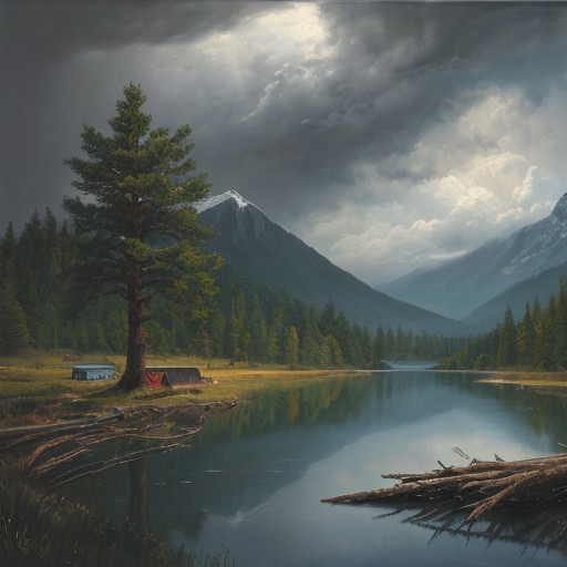 Masterpiece, high-resolution, oil painting, tall mountains, pine forest, log cabin, lake, large storm clouds in the distance