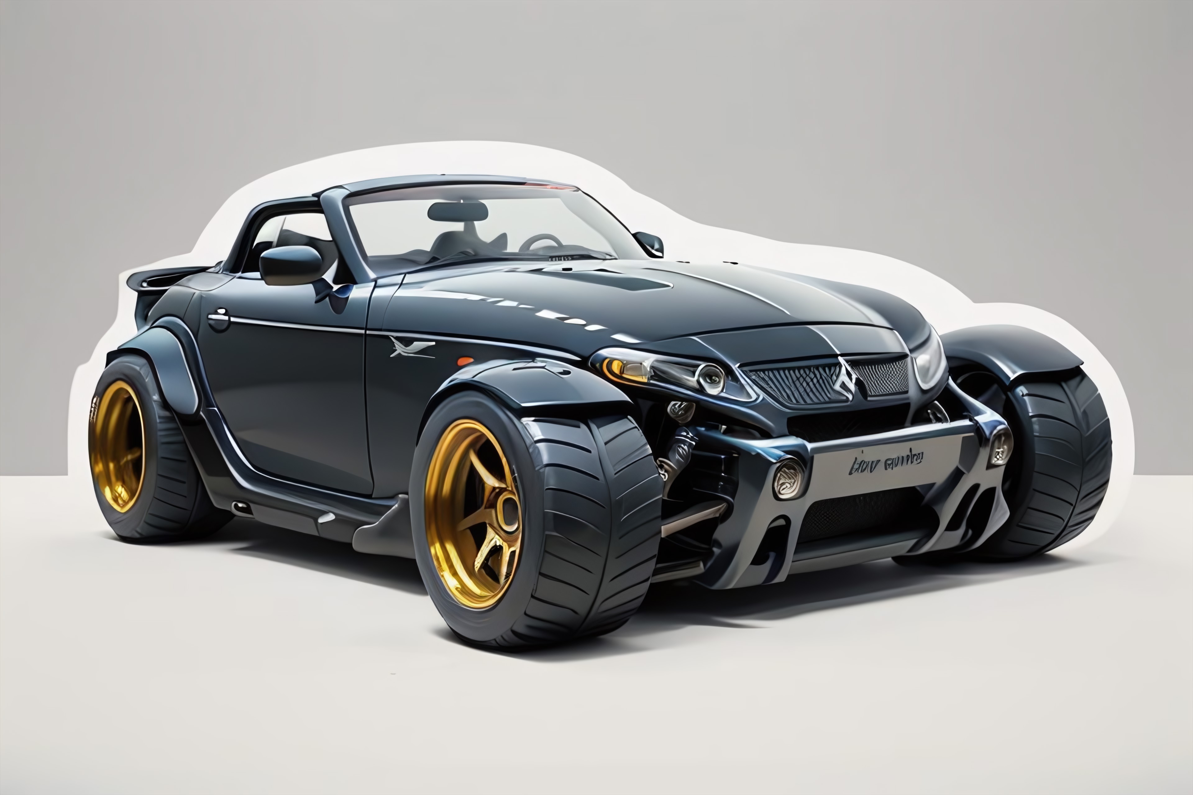 1999 Plymouth Prowler, oil panting effect with custom wheels, aggressive look custom paint, Tilt-shift photography, 3/4 view, 4K, 8K, extremely detailed, eye-catching color, masterpiece:1.2, (t-shirt sticker vector image) ultra details, bright vibrant color, different color paint splash graphite spray paint background,