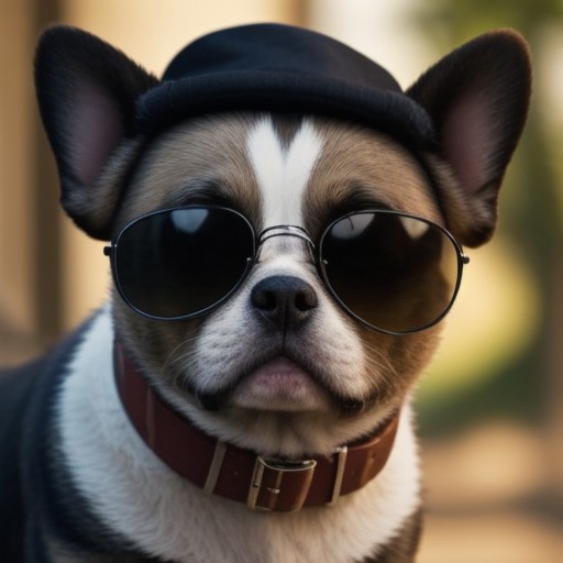 Close-Up cute fat chubby dogs with a Wide Angle Lens Wearing Hats and sunglasses, bandana around neck,